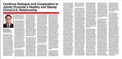 2020年10月1日,驻旧金山总领事王东华在领区主流英文媒体《旧金山观察家报》发表题为《坚持对话与合作,共同促进中美关系健康稳定发展》的署名文章,以庆祝国庆为契机,重点介绍习近平主席在联合国成立75周年系列高级别会议上的重要讲话精神,并结合当前中美关系现状有针对性地阐释我对中美关系的看法。王总领事在文章中指出,世界在变化,中国和美国在变化。我们要在变局中保持定力和清醒,认识和把握好其中的不变,即中国发展的根本目标没有改变;中国和平发展战略没有改变;和平、发展、合作、共赢的时代潮流没有改变;中国对美政策和战略定位没有改变;中美关系互利共赢的本质没有改变;中国愿与美方通过对话管控分歧的意愿没有改变;中美两国民间的深厚友谊没有改变。王总领事通过对七个“没有改变”的深入阐述,发出呼吁中美增进沟通理解,扩大交流合作,推进两国关系健康稳定发展的正面声音。主要内容如下: