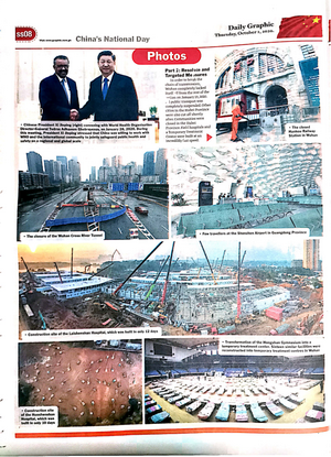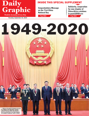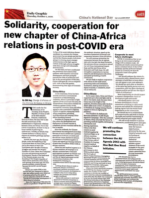 丹桂飘香,金秋送爽。在中华人民共和国71周年华诞来临之际,加纳最大报纸《每日写真报》发行中国国庆专刊,刊登加纳副总统巴武米亚、加纳驻华大使博阿滕、加中友协主席科乔大使的贺词、驻加纳使馆临时代办朱憬的署名文章以及中加各界人士的贺词,并配发中国抗击新冠肺炎疫情、中加各领域务实合作、中加联合抗疫成就图片展。专刊推出后,引发加纳社会各界广泛关注,民众纷纷为中国点赞,祝福两国友谊地久天长。