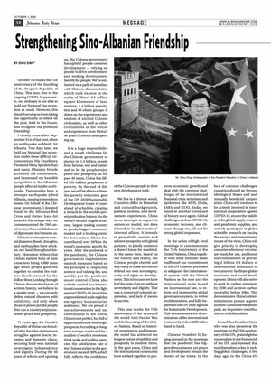 2020年9月30日、10月1日,驻阿尔巴尼亚大使周鼎分别在阿发行量最大的阿语日报《全景报》和英语报纸《阿尔巴尼亚日报》发表署名文章《弘扬传统友谊,携手推进可持续发展》,庆祝中华人民共和国71周年华诞。