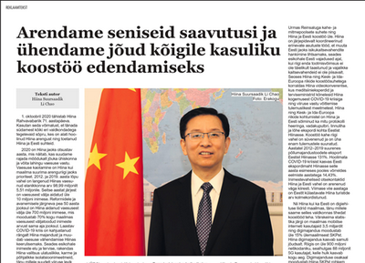 2020年10月1日,驻爱沙尼亚大使李超在爱媒体《晚报》的纸质版和网络版发表题为《继往开来,携手奋进,共筑合作共赢之路》的爱语署名文章,庆祝中华人民共和国成立71周年。文章阐述了中国的扶贫成就为世界减贫事业作出的突出贡献,指出面对突如其来的新冠肺炎疫情,中国在2020年全面建成小康社会的决心和信心坚定不移。李超大使强调,2020年是联合国成立75周年和中欧建交45周年,中国捍卫多边主义和推进构建人类命运共同体的决心不会动摇。