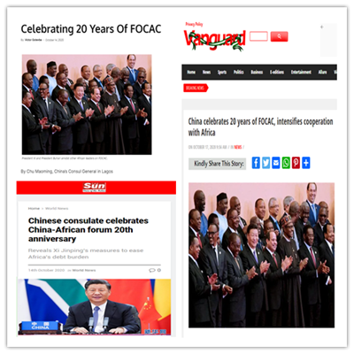 近日,尼日利亚《先锋报》、《卫报》、《独立报》、《太阳报》、《外交观察》、《非洲领导力》、《非中经济合作》、《拉各斯城市报》等英文媒体刊登驻拉各斯总领事储茂明署名文章《庆贺中非合作论坛成立20周年》。主要内容如下: