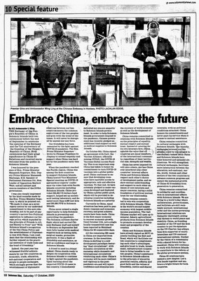 2020年10月17日,所罗门群岛最大英文报纸《所罗门星报》刊登驻所罗门群岛大使李明署名文章《拥抱中国就是拥抱未来》。主要内容如下: