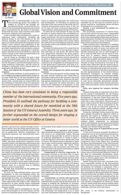 2020年10月21日,驻孟加拉国大使李极明在孟主流英文报纸《每日太阳报》发表《中国良治之文化溯源》随笔专栏系列文章之九——《世界胸怀 大国担当》,介绍习近平主席出席联合国成立75周年系列高级别会议情况,阐释习近平主席提出的重大理念主张及其重要意义影响。