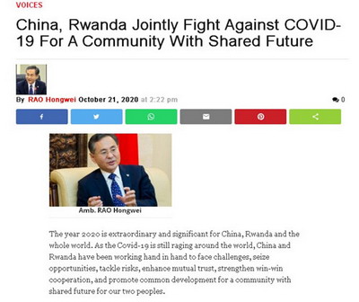 2020年10月21日,驻卢旺达大使饶宏伟在卢媒体《新时代报》、《今日基加利》和《时间》新闻网等刊登署名文章《中卢团结抗疫,共建命运共同体》,《时间》新闻网还专门登载了该文的卢旺达语版本。
