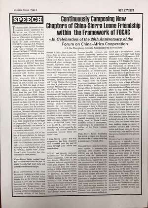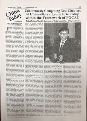 2020年10月27日,驻塞拉利昂大使胡张良在塞《阿沃克报》、《旗帜时报》、《协和时报》、《观察报》、《夜视报》、《独家报》等主流报纸发表署名文章《在中非合作论坛框架下不断谱写中塞友谊新篇章——庆祝中非合作论坛成立20周年》,主要内容如下: