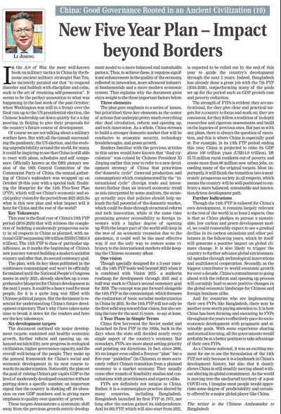 2020年11月21日,驻孟加拉国大使李极明在孟加拉国主流英文报纸《每日太阳报》发表《中国良治之文化溯源》随笔专栏系列文章之十:《新五年规划——超越国界的影响》,对十九届五中全会审议通过《中共中央关于制定国民经济和社会发展第十四个五年规划和二〇三五年远景目标的建议》作了简明解读。文章将《建议》要点归纳为“六项目标”、“三大元素”和“一个愿景”,并扼要介绍了中国实施“五年规划”的历史由来和重要意义。文章指出,十四五规划是今后五年乃至更长时间中国经济社会发展的行动指南,标志着中国即将开启全面建设社会主义现代化国家的新征程,在为充满未知的后疫情时代世界注入一针“稳定剂”的同时,还将带来更多发展机遇。文章提及,包括孟加拉国在内的许多国家均实施五年规划,可同中方加强经验交流,共同推动有关政策更好地指导本国经济社会发展。