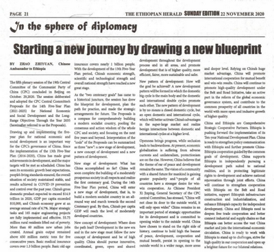 2020年11月22日,埃塞俄比亚官方报纸《埃塞先驱报》刊登驻埃塞俄比亚大使赵志远署名文章——《擘画新蓝图 开启新征程》,介绍中国共产党第十九届中央委员会第五次全体会议精神,译文如下: