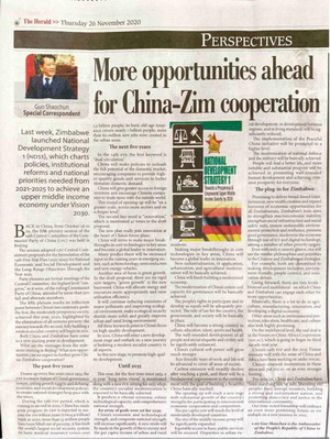 2020年11月26日,驻津巴布韦大使郭少春在津第一大报《先驱报》发表题为《中津合作再迎新机遇》的署名文章,结合津国家发展战略宣介党的十九届五中全会精神。