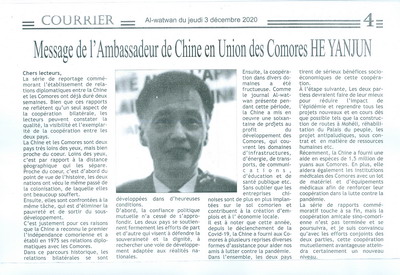 2020年12月3日,驻科摩罗大使何彦军在科摩罗官方媒体《祖国报》发表署名文章纪念中科建交45周年。文章结合中国使馆在该报连续刊登的《中科合作项目巡礼》专栏,回顾总结两国建交45年来双边关系发展取得的成就,介绍中科团结抗疫合作成果,重申愿继续与科在内的国际社会加强合作,全力打造人类卫生健康共同体。