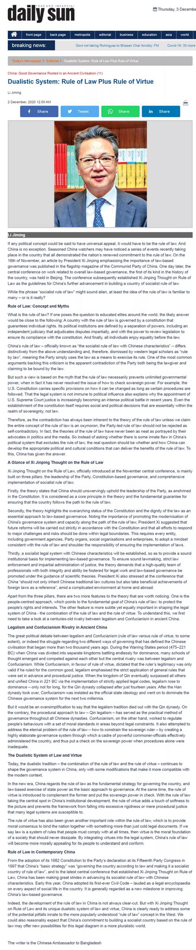 2020年12月2日,驻孟加拉国大使李极明在孟加拉国主流英文报纸《每日太阳报》发表《中国良治之文化溯源》随笔专栏系列文章之十一—《依法治国和以德治国相结合的二元体系》。概要如下:
