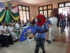 | 孔子课堂的老师带领桑岛学生表演太极扇 | 福利院的孩子穿戴整齐,载歌载舞 |