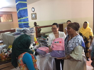 刘杰在桑妇女部部长和福利院院长的陪同下,首先参观儿童宿舍,与孩子们亲切交谈,询问他们的生活学习情况,并向孩子们分发糖果、饼干。福利院院长详细介绍该院情况,对刘杰女士为当地儿童福利工作作出积极贡献表示衷心感谢。
