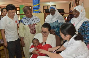 中国援桑医疗队的医生为福利院的儿童进行体检
