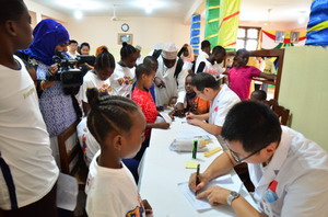 捐助活动后,中国医疗队为福利院的孩子们和工作人员进行了细致的健康检查。刘杰和桑总统夫人走访各个体检点,协助医疗队队员为年龄较小的孩子们进行体检。离别时,孩子们与大家紧紧拥抱,不舍之情溢于言表。
