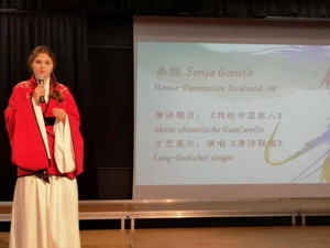 来自埃森伯乐高级文理中学合唱团的30多名学生以悠扬甜美的嗓音和字正腔圆的中文演唱的“茉莉花”和“在希望的田野上”为比赛拉开序幕。比赛分为知识问答、中文演讲和才艺展示三个环节。选手们在演讲中分享了他们对中国城市、美食、中医和中国家庭的认识以及在中国的各种经历,表达了自己真挚的“中国情结”和对中国文化的喜爱。才艺展示中,选手们各显神通,诗朗诵、少林棍、唐诗联唱、傣族舞和绸带舞等表演精彩纷呈,赢得了现场观众的阵阵掌声。