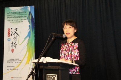 第十二届 “汉语桥” 世界中学生汉语比赛德国赛区决赛于2019年6月15日在不来梅举行。驻德国大使夫人郭金秋参赞出席并担任评委会主席。不来梅应用科技大学校长、不来梅孔子学院理事会主席卢凯教授委托不来梅孔子学院德方院长谢德勒教授、不来梅孔子课堂霍恩高级文理中学校长克尔姆女士分别致辞。在德孔子学院、孔子课堂院长及汉语教师、德国相关中学校长及教师、学生及参赛选手亲友200多人现场观摩比赛。