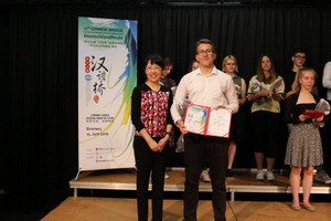 郭金秋参赞作为评委会主席对当天比赛进行了点评,宣布比赛结果并为获奖选手颁奖。她高度评价选手们的精彩表演和出色表现。她说,有过中国经历的参赛同学逐年增加,表明中德两国关系发展良好,交流频繁,大家对汉语和中国文化的兴趣日益浓厚。希望同学们学好汉语,精进本领,成为促进两国青年友谊的使者,为中德两国人文交流贡献力量。