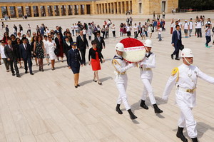 张华与法特玛一道在国父陵卫戍团礼兵的引领下,向土耳其共和国国父阿塔图尔克墓敬献了花篮,随鸣号默哀。