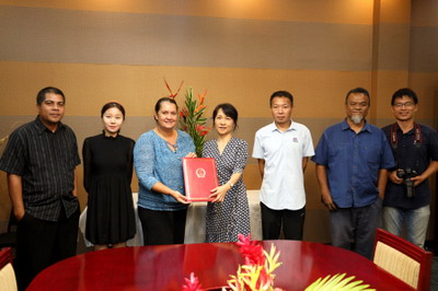 2020年10月15日,驻密克罗尼西亚联邦大使夫人赵迎光与中铁十四局驻密项目组前往总统府,代表中国使馆向第一夫人办公室捐赠文体用品。总统夫人帕特里夏·埃德温、外交部副部长布兰迪、中铁项目组现场负责人胡纪国等出席。