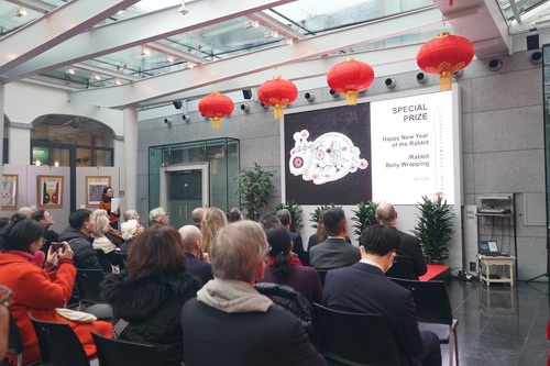 开幕式上曹忠明大使向部分获奖代表颁发获奖证书,以表彰他们对进一步推动中比、中欧人文交流作出的努力,有的获奖者从英国专程赶来领奖。开幕式后,曹忠明大使和现场嘉宾在彼特斯副主席的导览下饶有兴致地参观了展览。嘉宾们在获奖作品《太空兔》前驻足良久,感叹中国探月工程近年取得举世瞩目的成就。获奖代表还纷纷表示,本次设计大赛以“中国生肖”为主题,形式新颖且贴近生活,希望此类大赛能常态化举办,为比利时和欧洲民众了解中国传统文化提供更加多元化的平台。