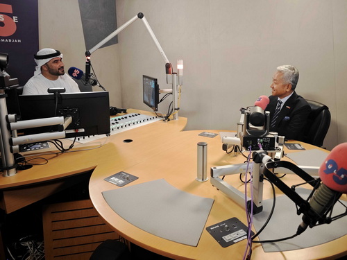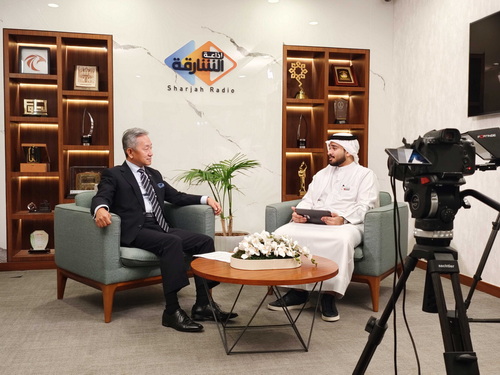 2025年11月20日,驻阿联酋大使张益明应邀接受沙迦电视台、“脉搏95”电台举办的阿联酋国庆54周年专访,宣介党的二十届四中全会精神,并就中阿关系、中国式现代化等回答记者提问。