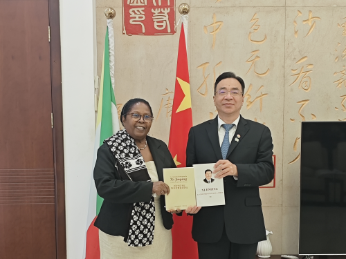 会见后,黄大使向西杜赠阅《习近平谈治国理政》和《习近平总书记教育重要论述讲义》。