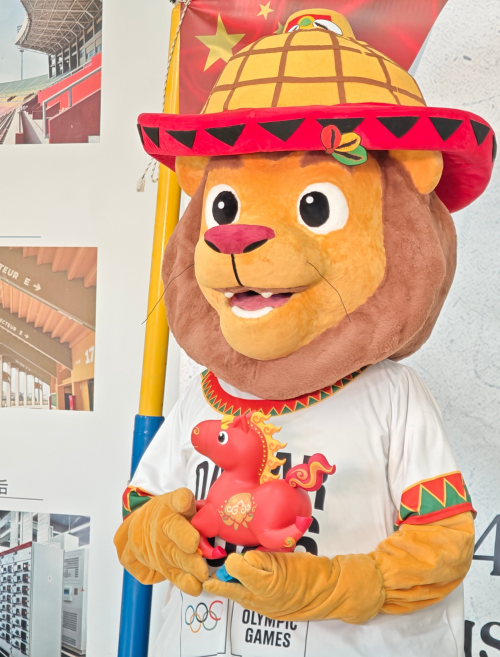 达喀尔青奥会吉祥物小狮子“AYO”的到来点燃全场,手捧“欢乐春节”吉祥物“生肖马”同现场来宾热情互动。