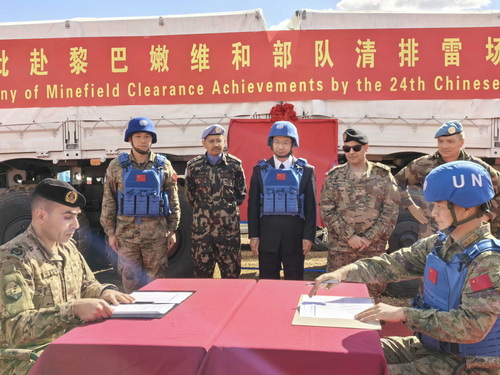 2026年2月4日,驻黎巴嫩大使陈传东赴黎南部马龙拉斯村出席中国第24批赴黎维和部队清排雷场交接仪式,与联黎部队副司令马哈拉少将、黎军利塔尼河以南军区司令代表等120余人共同见证中国维和部队向黎军移交2处清排完毕雷场。