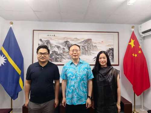 2026年4月17日,驻瑙鲁大使吕进在使馆会见好心国际船运公司总裁冯胜蓝一行。双方就加强中瑙航运物流合作等议题深入交流。