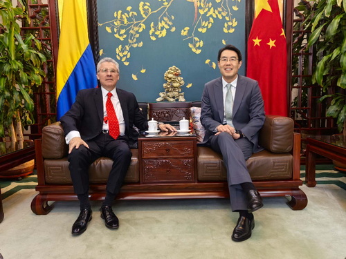 2026年4月23日,驻哥伦比亚大使朱京阳会见哥货运企业家联合会主席奎尔沃,就双边合作进行交流。