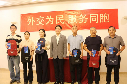 律大使并现场为侨胞代表发放领保物资。