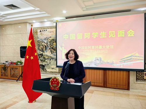 2025年11月29日,驻阿塞拜疆使馆举办中国留阿学生见面会,驻阿塞拜疆大使鲁梅出席并致辞。中国留阿学生会成员、2025年新生及各高校学生代表参加。