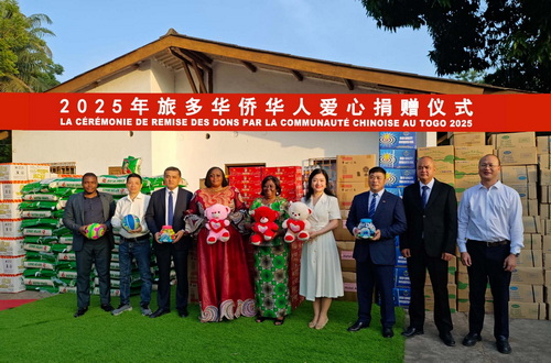 2025年12月16日,驻多哥大使王敏出席旅多华侨华人爱心捐赠仪式,为数千名多哥弱势儿童发放新年礼包。多妇女儿童部长桑卡雷贾、国家救济署长帕查、旅多侨胞代表等出席。