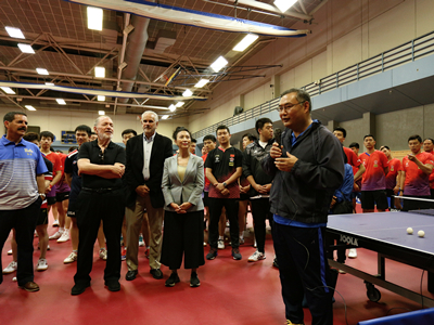 张总领事欢迎国乒队来洛训练,赞扬国乒队是一支具有光荣历史、优良传统的球队,多年来拼搏奋进,为祖国和人民赢得诸多荣誉,是中国人民心中的英雄,是全体中华儿女的骄傲。张总领事表示,乒乓球在中美关系正常化过程中也起到重要作用,“乒乓外交”不仅拉近中美两国人民间的距离,而且拉开了中美关系改善和发展的历史序幕。多年来,国乒队弘扬“乒乓外交”精神,通过体育交流积极致力于增进中外人民相互了解和友谊。相信此次国乒队来美集训也能为促进中美人文交流、深化两国人民之间友谊发挥积极作用,续写中美友好的新篇章。张总领事感谢加州大学洛杉矶分校和美国乒乓球协会为中国国家队提供的各项便利和周到安排。