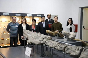 2019年8月28日,驻阿根廷大使邹肖力在访问内乌肯省期间参观萨帕拉市自然博物馆,该馆负责人、地质学家鲁塞索利陪同。