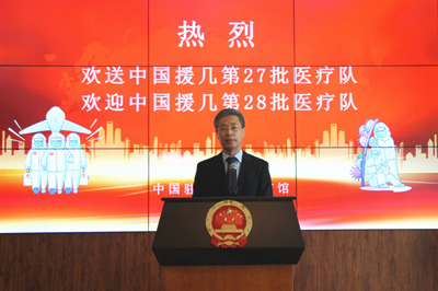 2020年9月18日,驻几内亚大使黄巍偕夫人余慧在使馆举行仪式,欢送第27批援几医疗队任满回国,欢迎第28批医疗队到几工作。两批医疗队全体队员及使馆主要外交官参加。