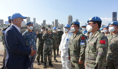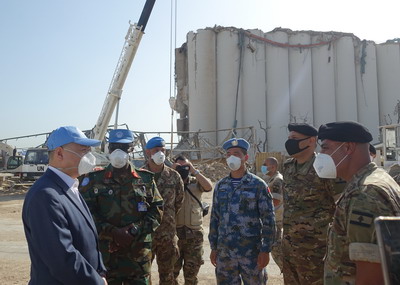 2020年10月1日,在国庆、中秋“双节”来临之际,驻黎巴嫩大使王克俭前往贝鲁特港,看望正在参与港口大爆炸废墟清理工作的中国第19批赴黎巴嫩维和官兵。联黎部队副司令阿里耶蒂和黎军代表海德尔陪同。