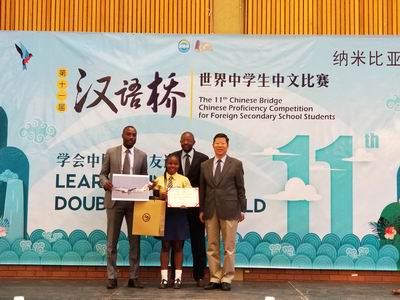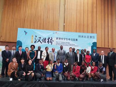 来自毛泽东中学、海莱因中学等学校的10名选手各显神通,经过中文演讲、知识问答和才艺展示三个环节的激烈角逐,最终来自海莱因中学学生夺冠,她将与第二名一起代表纳米比亚赴华参加世界中学生“汉语桥”比赛。李代办和纳大孔院外方院长施沃罗博士共同为获奖选手颁奖。
