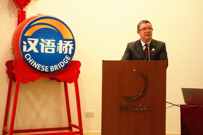 林代办向扎耶德大学孔子学院为本次比赛所作的精心安排表示感谢,向入围决赛的选手们表示祝贺。林代办在致辞中表示,三年前,阿联酋只有一所公立中文学校。今天,阿布扎比王储穆罕默德殿下提出的“百校计划”正如火如荼地展开,汉语教学已在阿联酋6个酋长国的11所中学落地生根,未来有望在阿全国200所学校开设中文课程,将有越来越多的阿联酋孩子们学习中文。