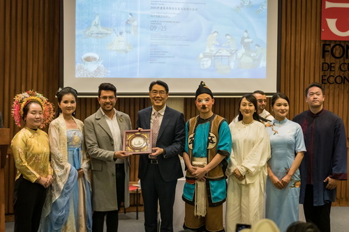 泉州艺术家进行茶艺、南音、提线木偶、高甲戏和簪花表演。哥方专家讲解了哥咖啡种植历史和咖啡文化。