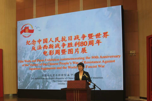 2025年10月15日,驻毛里求斯使馆在毛里求斯中国文化中心举办纪念中国人民抗日战争暨世界反法西斯战争胜利80周年电影周开幕式暨图片展,驻毛里求斯大使黄世芳,毛副总统洪利、国民议会议长奇夫拉、各国驻毛使节、毛各界友好人士等出席活动。