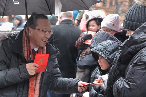 活动当天市中心主要路段临时封闭,唐锐总领事与嘉宾们加入巡游队伍,沿途向英民众派发“红包”、送上祝福。现场设有中华文艺演出及非遗互动展台,让人们沉浸式体验博大精深的中华文化。