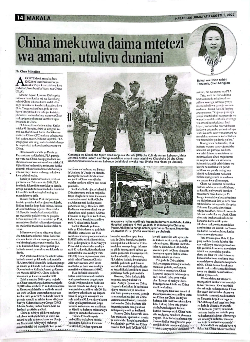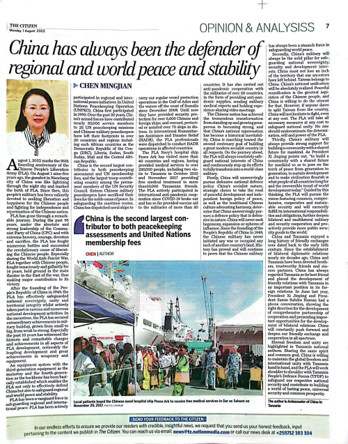 2022年8月1日,在中国人民解放军建军95周年之际,驻坦桑尼亚大使陈明健在坦主流英语报刊《公民报》和斯瓦希里语报刊《今日新闻》发表题为《中国始终是地区与世界和平稳定的捍卫者》的署名文章,回顾解放军在中国共产党领导下的95年辉煌历程,尤其是进入新时代以来的历史性成就,强调解放军始终是维护地区与世界和平的先锋力量。文章主要内容如下: