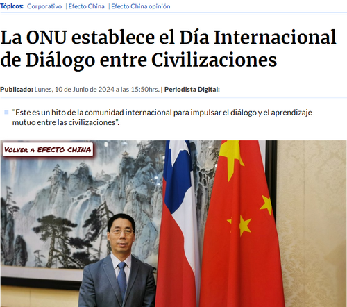 2024年6月10日,驻智利大使牛清报在智利合作社电台网站发表署名文章,热烈祝贺联大通过中国等国家发起的决议,将每年6月10日定为“文明对话国际日”。强调设立文明对话国际日同联合国一贯倡导文明对话与和解一脉相承,与推动落实全球文明倡议高度契合。在全球多地武装冲突频仍、个别国家以“价值观联盟”之名行地缘对抗之实的当下,设立文明对话国际日恰逢其时,有利于文明互鉴、弥合分歧、增进了解,团结应对全球性挑战。全文如下: