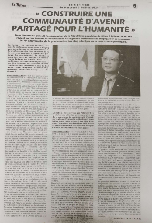 2024年7月3日,吉布提主要官方报纸《民族报》刊登就和平共处五项原则和人类命运共同体重要理念对驻吉布提大使胡斌的采访。全文如下: