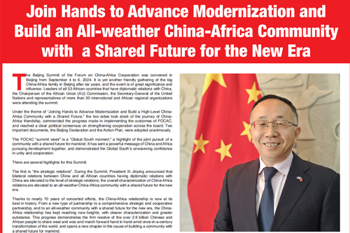 2024年9月4日至6日,中非合作论坛峰会在北京举行。中非友好大家庭时隔6年再聚北京,共襄盛举,意义重大,影响深远。非洲所有53个建交国的领导人和非盟委员会主席与会,联合国秘书长以及30多个国际和非洲地区组织代表出席。峰会期间,中非双方围绕“携手推进现代化,共筑高水平中非命运共同体”这一主题,回顾总结了中非友好历程,高度评价论坛成果落实进展,就加强中非全方位合作达成明确政治共识,一致通过了《北京宣言》和《行动计划》两份重要文件。中非“峰会周”,点亮了共筑人类命运共同体的“南方时刻”,发出了中非共谋发展的时代强音,彰显了“全球南方”团结合作的坚定信心。
