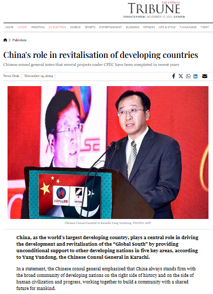 2024年11月14日,驻卡拉奇总领事杨云东在巴媒体《论坛快报》发表署名文章《中国为发展中国家振兴提供助力》,梳理阐述中方为包括巴基斯坦在内的发展中国家群体性崛起提供工业化、出口、绿色、创新、民生等五大方面助力,强调愿同巴方落实好两国领导人达成的重要共识,携手构建新时代更加紧密的中巴命运共同体。全文如下: