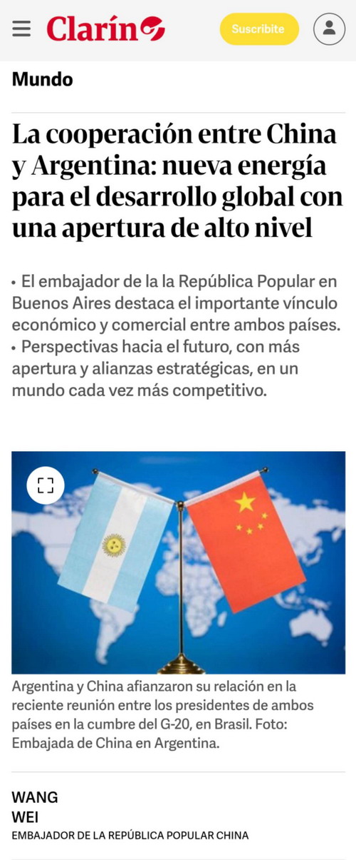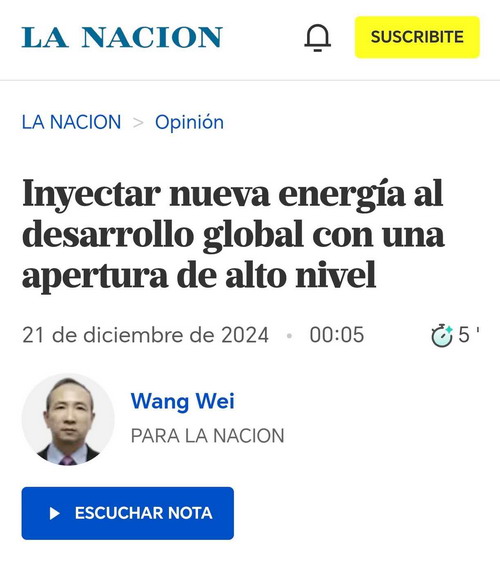 2024年12月21日,驻阿根廷大使王卫在阿根廷主流媒体《号角报》《国民报》等发表题为《以高水平对外开放为世界发展注入新动能》的署名文章,宣介中央经济工作会议精神,强调中国扩大高水平对外开放将为包括阿根廷在内的全球繁荣发展注入新动能。全文如下: