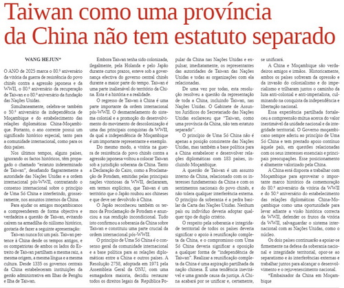 2025年3月14日,驻莫桑比克大使王贺军在莫桑比克《消息报》发表署名文章《台湾作为中国的一个省没有独立地位》,全文如下: