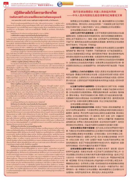 全球治理倡议凝聚中泰共识。全球南方求和平、谋发展、促合作的呼声日益高涨,完善全球治理、纠正历史不公的紧迫性不断上升。全球治理倡议深刻契合全球南方维护发展中国家共同利益、追求公平正义的诉求。今年是中泰建交50周年。半个世纪以来,两国始终相互理解、相互尊重,双方在涉及彼此核心利益和重大关切问题上相互支持,尊重彼此的独立、主权和领土完整,支持各自走符合本国国情的发展道路,中泰关系保持健康稳定快速发展。在当前这一关键历史节点,我们愿同泰方一道,积极践行全球治理倡议,推动构建更加公正合理的全球治理体系,共同开创美好未来,携手迈向人类命运共同体。